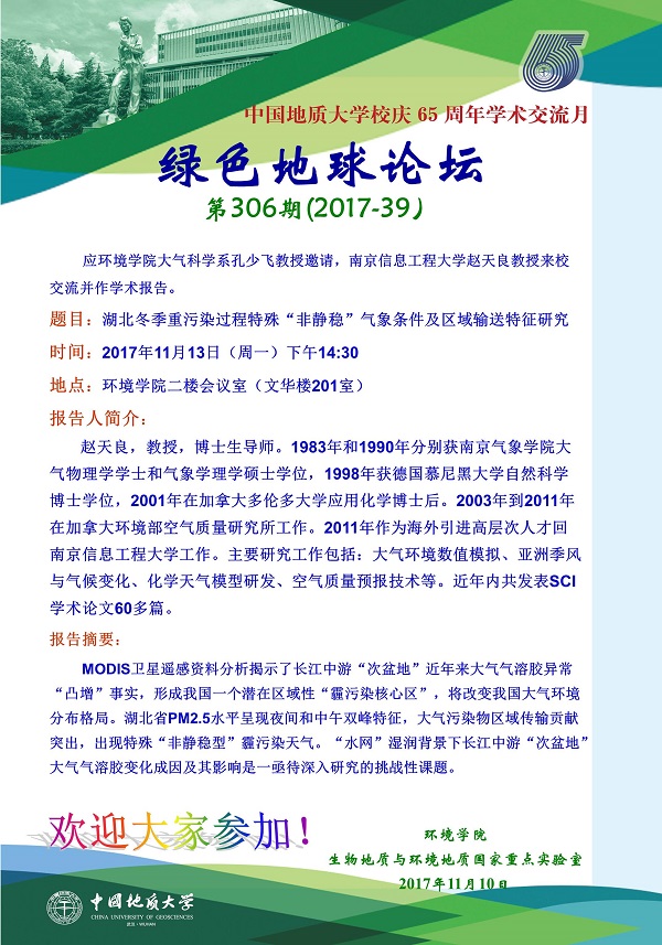 绿色地球论坛第306期(2017-39) ——p站视频 系列学术报告会 题目:湖北冬季重污染过程特殊“非静稳”气象条件及区域输送特征研究 时间:2017年11月13日(周一)下午14:30 地点:p站视频 二楼会议室(文华楼201室)