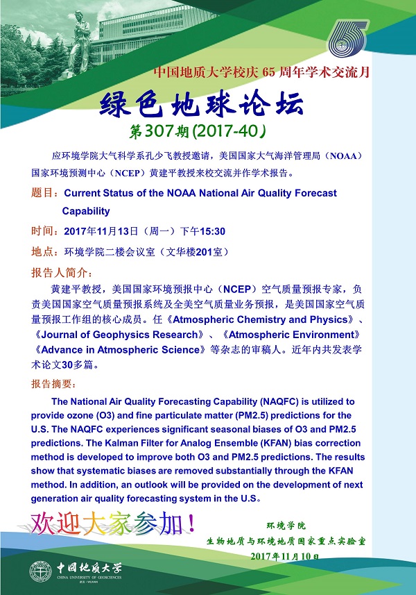 绿色地球论坛第307期(2017-40) ——p站视频 系列学术报告会 题目:Current Status of the NOAA National Air Quality Forecast Capability 时间:2017年11月13日(周一)下午15:30 地点:p站视频 二楼会议室(文华楼201室)