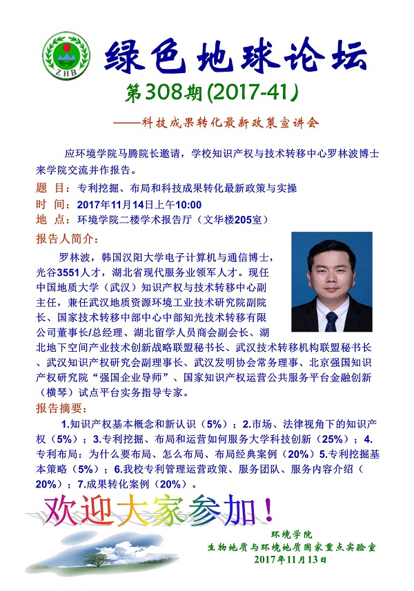 绿色地球论坛第308期(2017-41) ——p站视频 系列学术报告会 题目:专利挖掘、布局和科技成果转化最新政策与实操 时间:2017年11月14日(周二)上午10:00 地点:p站视频 二楼学术报告厅(文华楼205室)