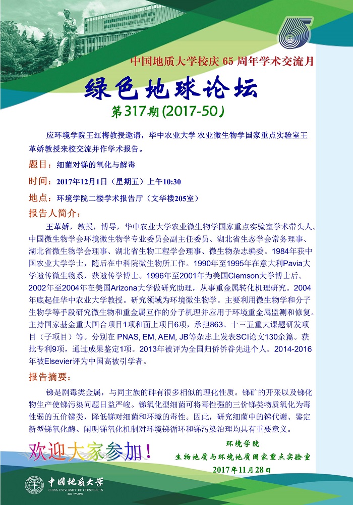 绿色地球论坛第317期(2017-50) p站视频 “校庆65周年学术交流月”——高知论坛 题目:细菌对锑的氧化与解毒 时间:2017年12月1日(周五)上午10:30 地点:p站视频 二楼学术报告厅(文华楼205室)
