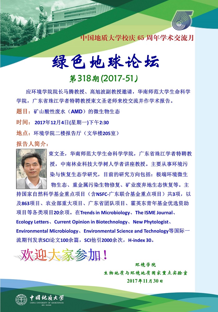绿色地球论坛第318期(2017-51) p站视频 “校庆65周年学术交流月”——高知论坛 题目:矿山酸性废水(AMD)的微生物生态 时间:2017年12月4日(周一)下午14:30 地点:p站视频 二楼学术报告厅(文华楼205室)