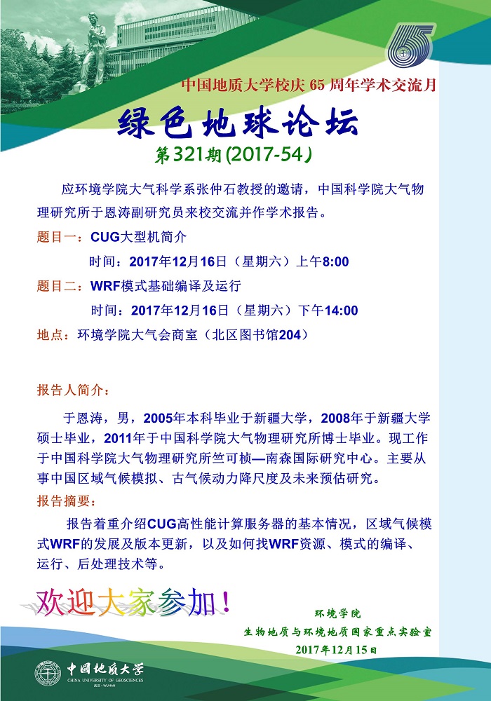 绿色地球论坛第321期(2017-54) p站视频 “校庆65周年学术交流月”——高知论坛 题目一:CUG大型机简介 时间:2017年12月16日(星期六)上午8:00 题目二:WRF模式基础编译及运行 时间:2017年12月16日(星期六)下午14:00 地点:p站视频 大气会商室(北区图书馆204)