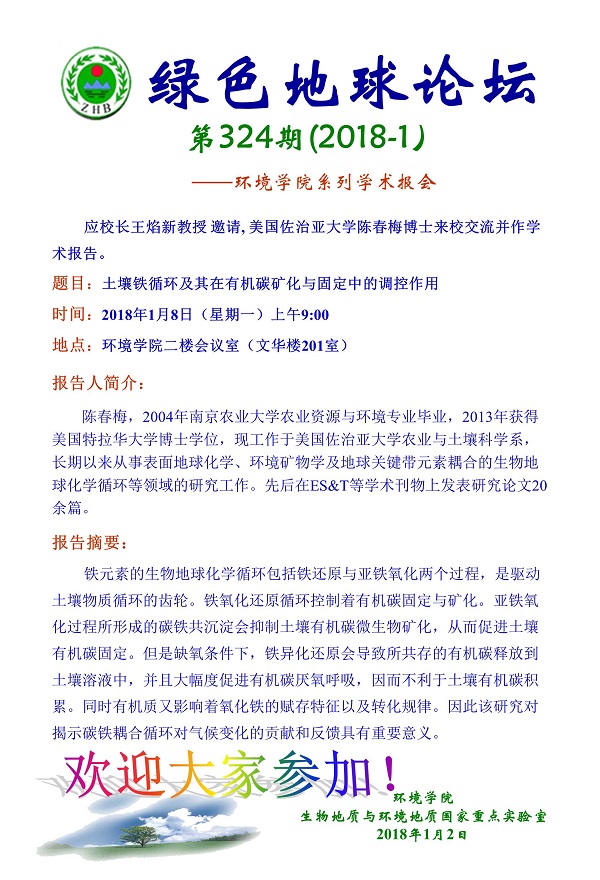 绿色地球论坛第324期(2018-1)——p站视频 系列学术报告会 题目:土壤铁循环及其在有机碳矿化与固定中的调控作用 时间:2018年1月8日(星期一)上午9:00 地点:p站视频 二楼会议室(文华楼201室)