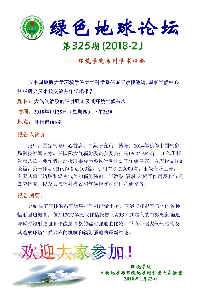 绿色地球论坛第325期(2018-2)——p站视频 系列学术报告会 题目:大气气溶胶的辐射强迫及其环境气候效应 时间:2018年1月25日(星期四)下午2:30 地点:丹桂苑105室
