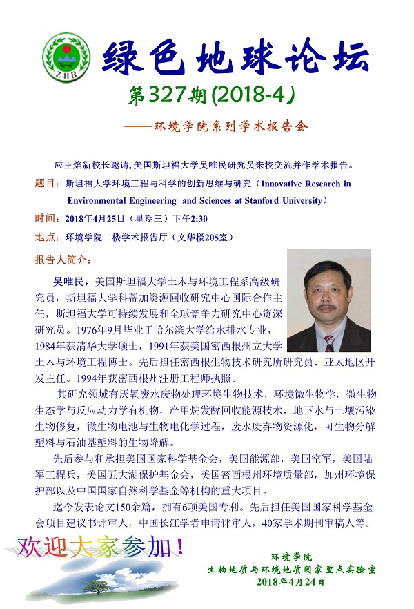 绿色地球论坛第327期(2018-4) ——p站视频 系列学术报告会 题目:斯坦福大学环境工程与科学的创新思维与研究(Innovative Research in Environmental Engineering and Sciences at Stanford University) 时间:2018年4月25日(周三)下午2:30 地点:p站视频 二楼学术报告厅(文华楼205室)