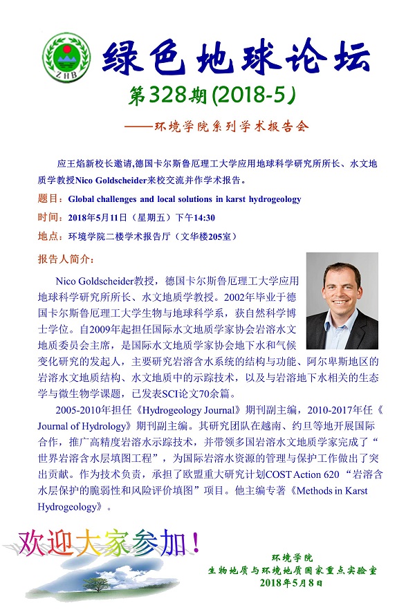 绿色地球论坛第328期(2018-5) ——p站视频 系列学术报告会 题目:Global challenges and local solutions in karst hydrogeology 时间:2018年5月11日(周五)下午14:30 地点:p站视频 二楼学术报告厅(文华楼205室)