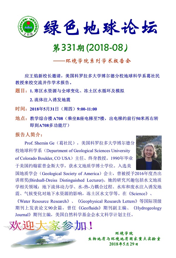 绿色地球论坛第331期(2018-8) ——p站视频 系列学术报告会 题目: 1. 寒区水资源与全球变化、冻土区水循环及模拟 2. 流体注入诱发地震 时间:2018年5月31日(周四)9:00-11:00 地点:教学综合楼 A708(乘坐B座电梯至7楼,出电梯约前行50米再右转即到 A708多功能厅)