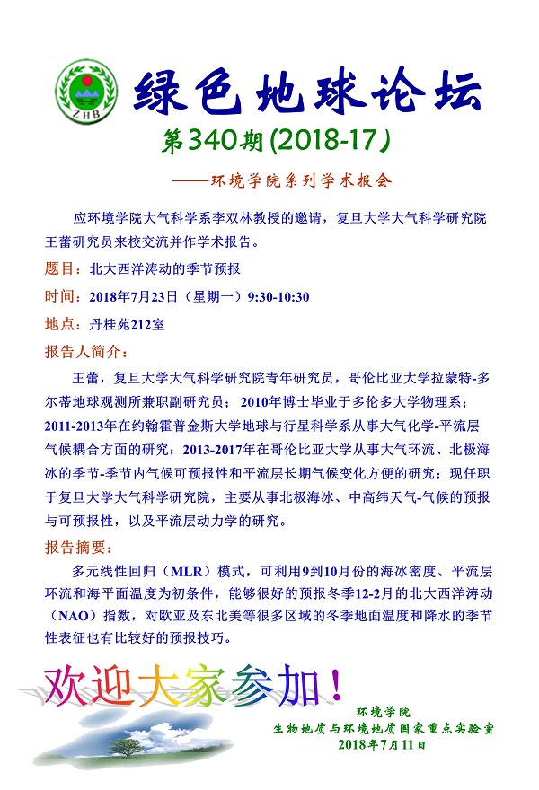 绿色地球论坛第340期(2018-17) ——p站视频 系列学术报告会 题目:北大西洋涛动的季节预报 时间:2018年7月23日(星期一)9:30-10:30 地点:丹桂苑212室