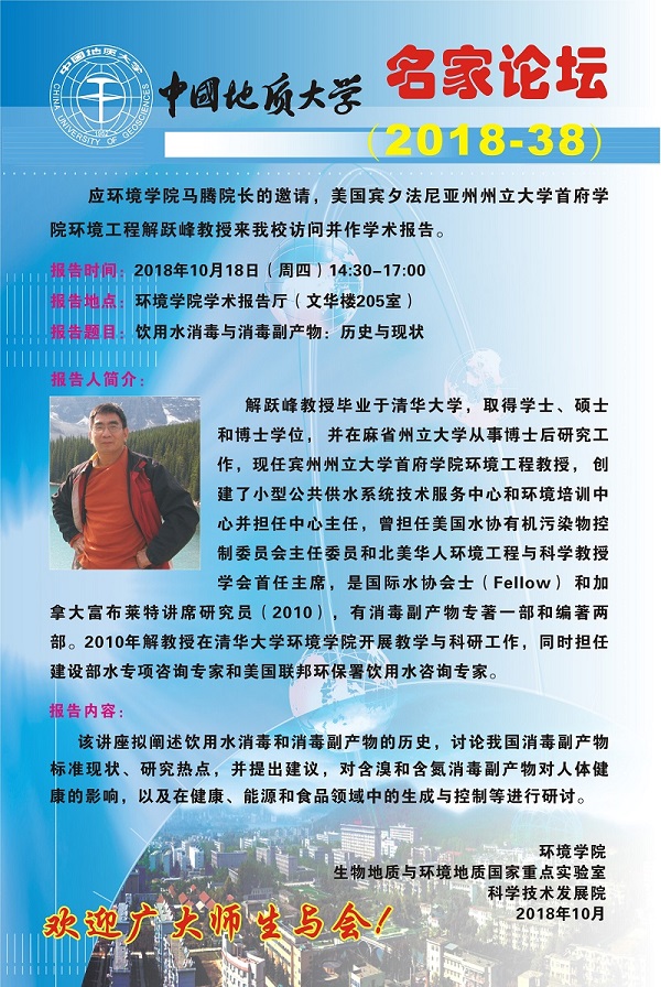 名家论坛(2018-38) 题目:饮用水消毒与消毒副产物:历史与现状 时间:2018年10月18日(周四)14:30 地点:p站视频 学术报告厅(文华楼205室)