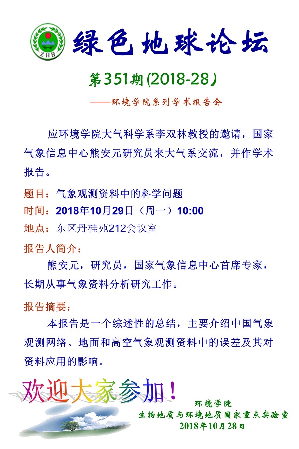 绿色地球论坛第351期(2018-28) ——p站视频 系列学术报告会 题目:气象观测资料中的科学问题 时间:2018年10月29日(周一)上午10:00 地点:丹桂苑212室