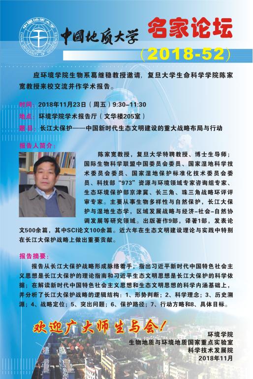 名家论坛(2018-52) 题目:长江大保护——中国新时代生态文明建设的重大战略布局与行动 时间:2018年11月23日(周五)9:30—11:30 地点:p站视频 学术报告厅(文华楼205室)