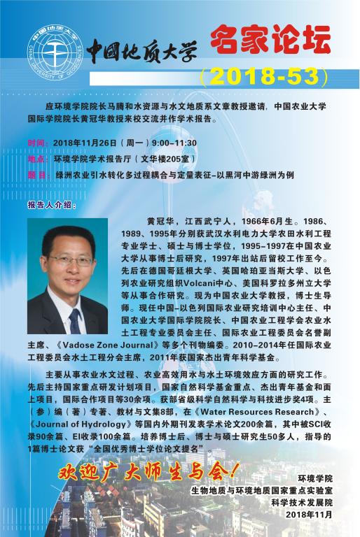 名家论坛(2018-53) 题目:绿洲农业引水转化多过程耦合与定量表征-以黑河中游绿洲为例 时间:2018年11月26日(周一)9:00—11:30 地点:p站视频 学术报告厅(文华楼205室)