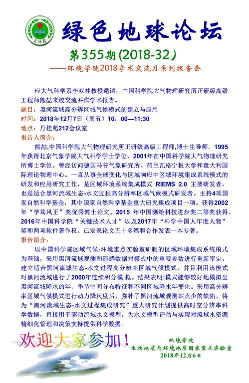 绿色地球论坛第355期(2018-32) ——p站视频 2018学术交流月系列报告会 题目:黑河流域高分辨区域气候模式的建立与应用 时间:2018年12月7日(周五)10:00—11:30 地点:丹桂苑212会议室