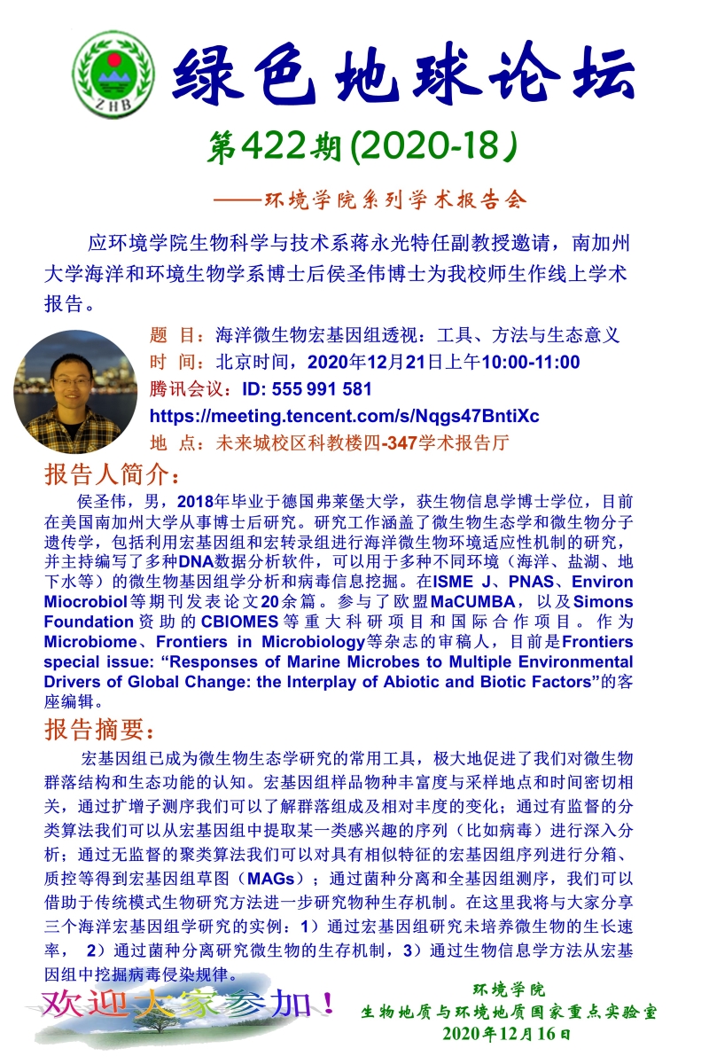 南加州大学海洋和环境生物学系博士后侯圣伟博士学术报告