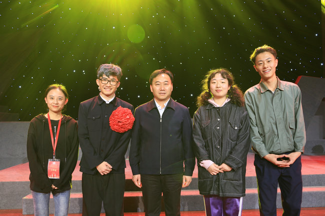 学院党委书记李素矿看望参与演出的环境学子(从左至右依次为张雨瑶、郄泽峰、李素矿、胡可涵、原浩)