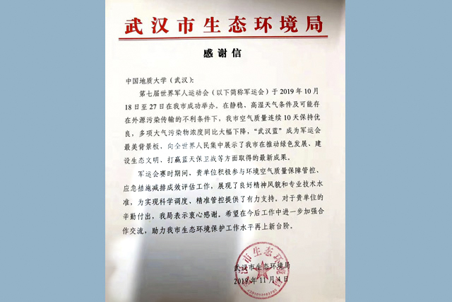 (通讯员张学海)近日,学校收到了一封特别的感谢信,信中写道:“军运会期间,贵单位积极参与环境空气质量保障管控、应急措施减排成效评估工作,展现了良好精神风貌和专业技术水准,为实现科学调度、精准管控提供了有力支持。对于贵单位的辛勤付出,表示衷心感谢。”